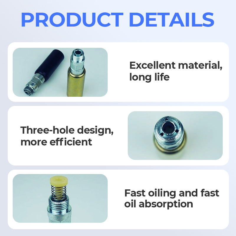 Издръжлива конструкция, надеждна работа: конекторите за горивна помпа за дизелови двигатели имат здрава конструкция от две части, с черна цилиндрична (гумена или пластмасова) горна част и сребриста метална основа с резба в долната част. Тази комбинация осигурява устойчивост на корозия на горивото, високо налягане и температурни колебания и осигурява дълъг експлоатационен живот в тежките условия на работа на дизеловите двигатели.